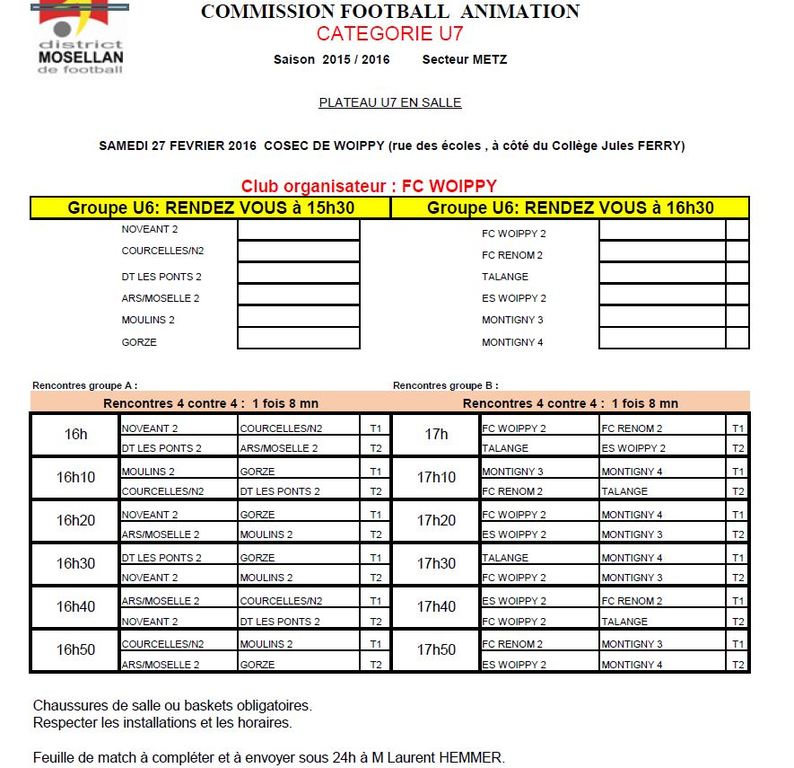 COSEC DE WOIPPY Rue Des Ecoles à côté du collège Jules Ferry Premier Match 16 h10 Dernier Match 16 h 50