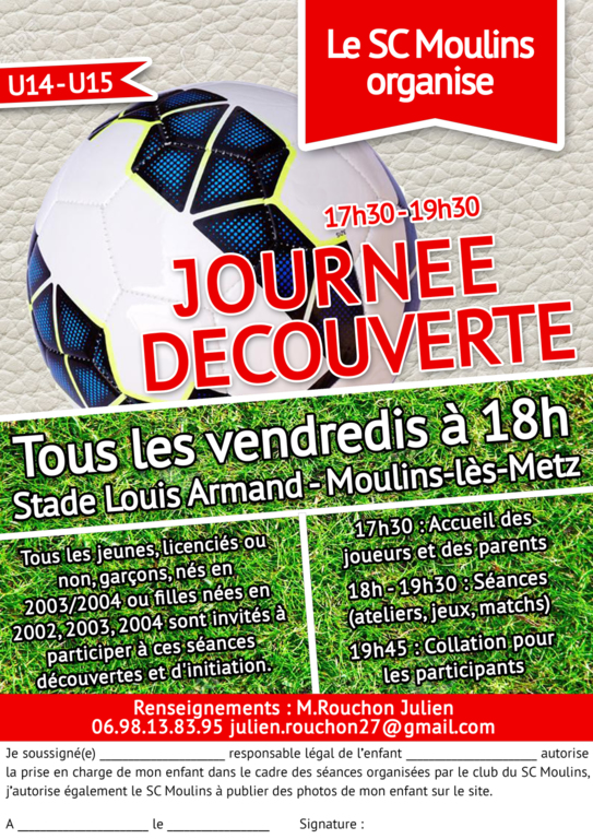 A partir du vendredi 28 avril 2017, tous les joueurs nés en 2003, 2004 voir 2005 ainsi que les joueuses 2002, 2003 et 2004 sont invités si vous le souhaitez à venir s'entrainer avec les U15 sur les installations du club dès 18h00 sur le terrain. Ces séances " découvertes" pour certains permettront de découverte le football à 11 et envisager la création d'une équipe U15 au SC Moulins pour la saison 2017/2018.